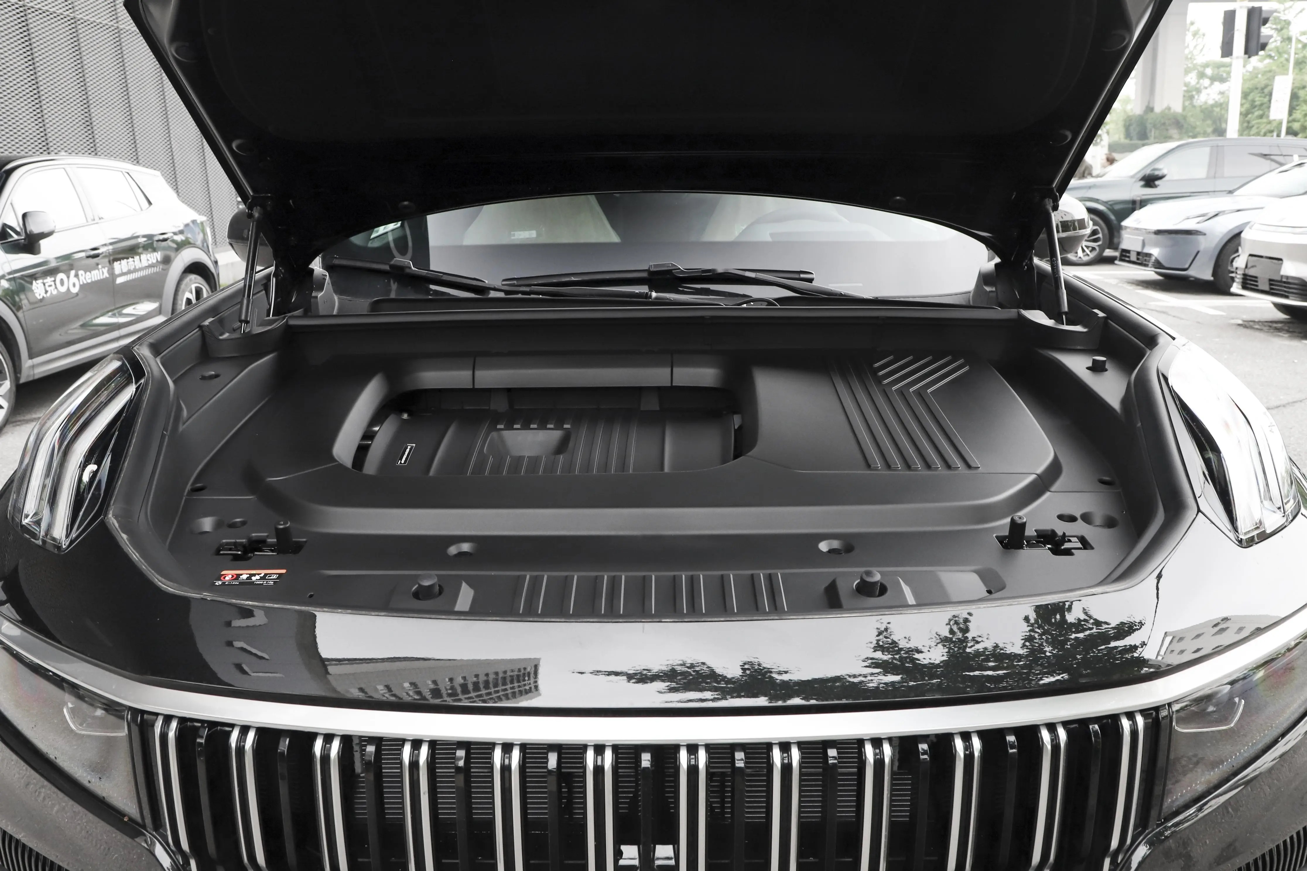 领克09燃油版的外观设计能让人一眼就记住。前脸采用了领克家族标志性的设计语言,大尺寸直瀑式进气格栅搭配镀铬装饰条,排列有序,阳光下闪耀金属光泽,营造出大气且力量感十足的视觉效果。分体式大灯组是其显著特征,上方的“北极之光”LED日行灯与引擎盖融为一体,下方大灯组则与进气格栅相连,整体造型独特,辨识度极高。此外,雾灯区的进气道设计规整,进一步增强了前脸的沉稳感。