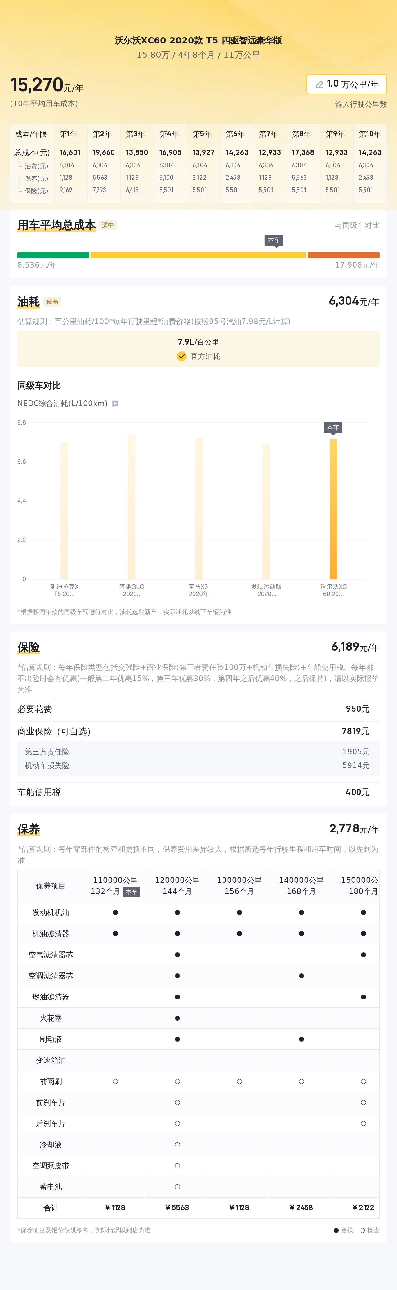 关于用车成本部分,根据懂车帝的大数据分析,该车的10年平均用车成本大概是15144元/年,10年能耗成本大概是11444元/年,也可以看一下同级别车的最低10年能耗成本9850元/年,最高13727元/年,10年保值率大概是46.47%,也可以参考同级别车的保值率,最低34.93%,最高52.31%。这些数据都可以帮助您全面的了解这辆车,当然,具体用车成本还是要根据车辆的实际使用情况而定。