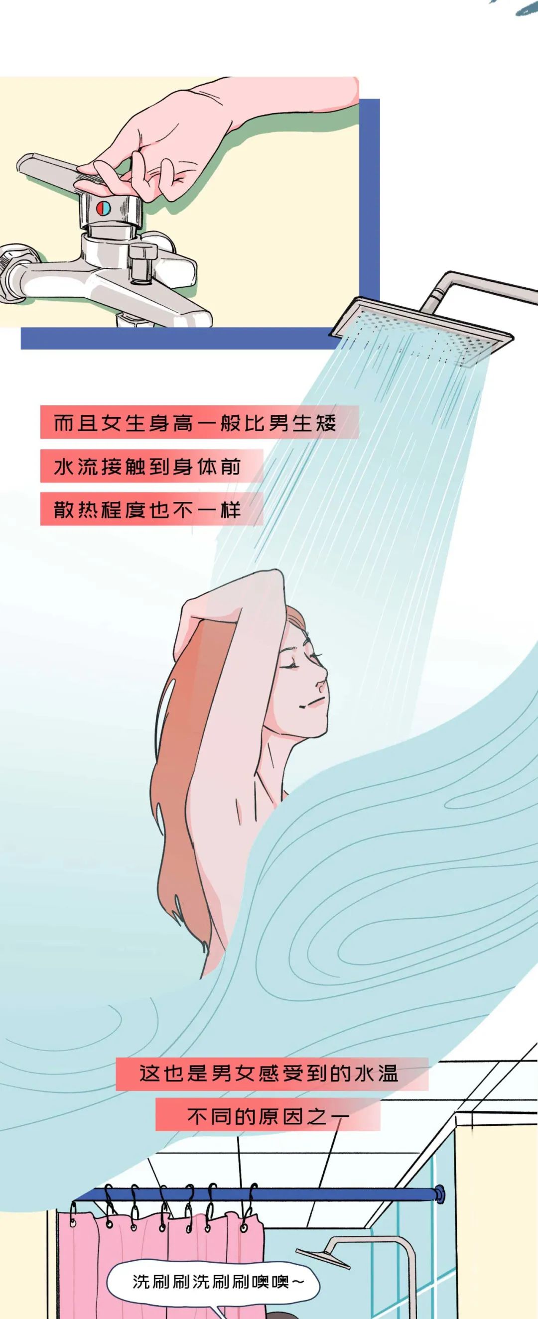 比如首当其冲的 “空间生存战”。大部分家用浴室本来就窄,两个人挤进去堪比 “密室挑战”:你想转身冲头发,胳膊肘直接怼到她肚子;她刚涂满沐浴露想搓泡泡,你一抬胳膊把泡沫蹭得满墙都是。更绝的是抢热水 —— 女生刚把头发打湿,水温突然变凉,一转头发现男生正对着花洒 “吨吨” 冲后背,她只能裹着浴巾缩在角落喊 “你再抢我热水,我就把你洗面奶挤光!”,浪漫氛围?早被 “能不能给我留半格空间” 的灵魂拷问冲没了。