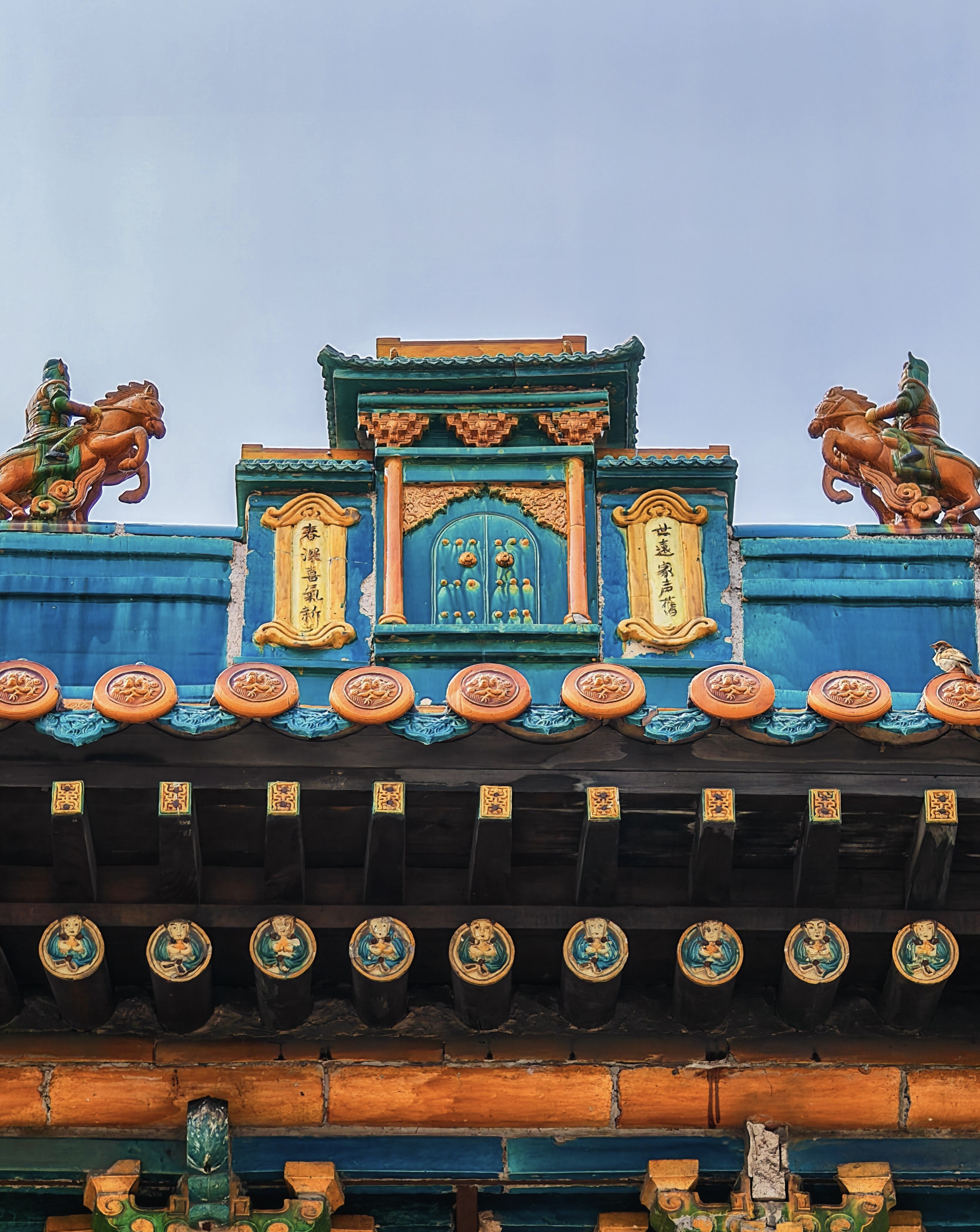 往上看,斗拱和屋顶的花样能把人看傻。主楼的五踩斗拱,每一个零件都是琉璃做的,却愣是拼出了木头的榫卯结构,连斗拱上的"蚂蚱头"都带着弧度,不知道的还以为是玉雕的。次楼的三踩斗拱看着简单,可那简化的分寸拿捏得比山西老陈醋的酸度还精准,多一分显赘,少一分露怯。最让人挪不开眼的是屋顶,黄蓝琉璃瓦拼出的"回"字纹,远看像水波在流动,近看才发现每片瓦当的纹路都不一样,有说这是道家的"循环往复",也有说这是晋商的"财源滚滚",反正各有各的理,吵到最后往往以"来都来了,先拍张照"收尾。