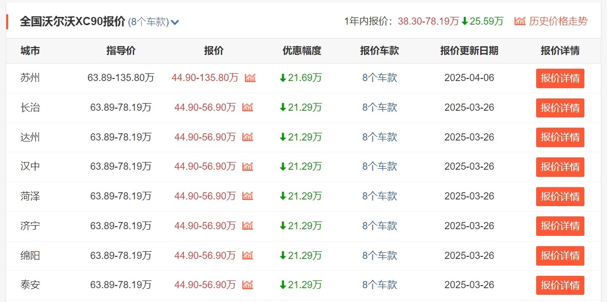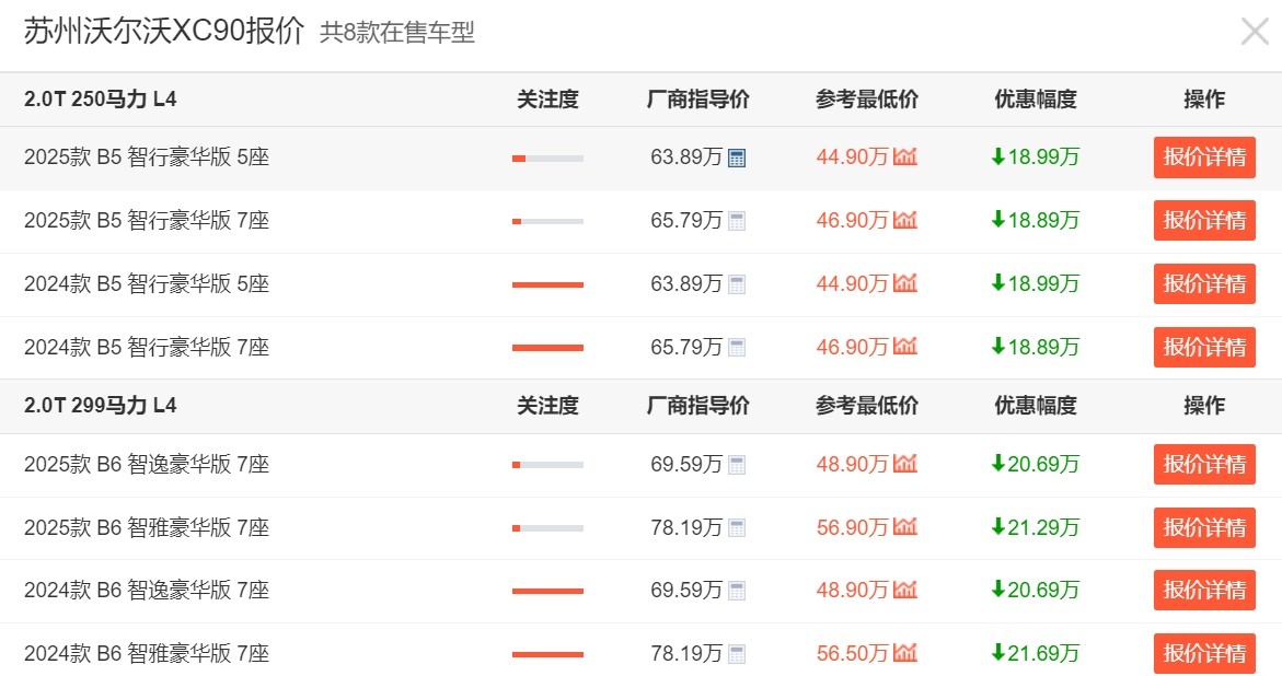 此外,如果你是做分期,很多地区的裸车价甚至都已经给到了40万以下,那这也就意味着,其实我们花45万左右的价格就能落地这款车的最低配,还是很有性价比的。以下是现款沃尔沃XC90在售车型优惠情况,可供大家参考。