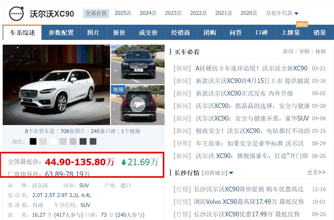 先来看目前在售现款沃尔沃XC90在终端的优惠情况。据我们从多地经销商处所了解到的信息,目前老款沃尔沃XC90在终端普遍拥有19万起步的优惠,而优惠完之后,新车最低价格也已经来到了44.9万元区间,属实是降幅很高了。