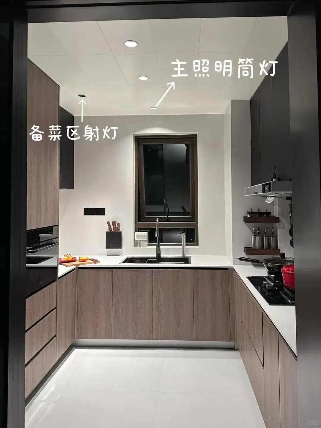然后,在需要的地方增加重点照明,拿厨房灯光举例,可以设置主照明的筒灯,然后再在备菜区设置一盏射灯。