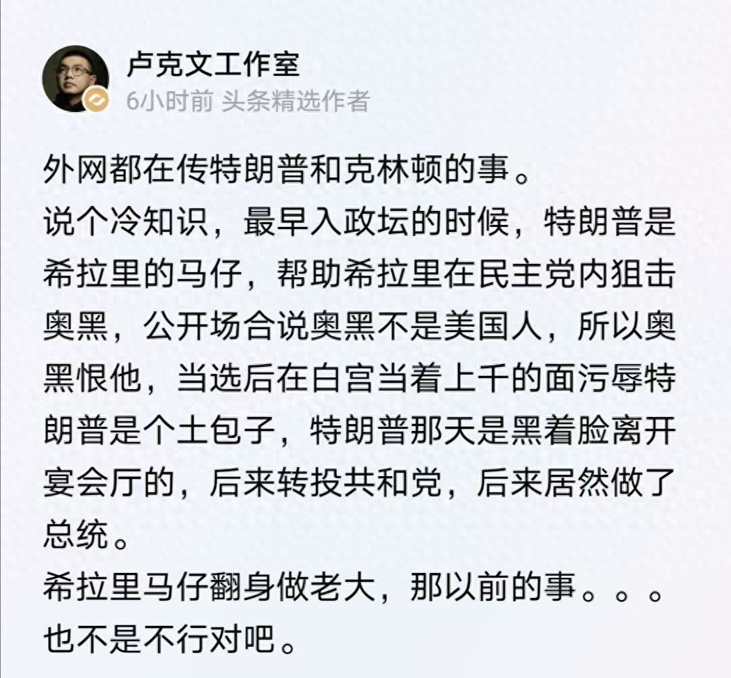卢克文说,外网上正在传一个非常有趣的事,特朗普和克林顿的关系,听着有点复杂,大家可以脑补。