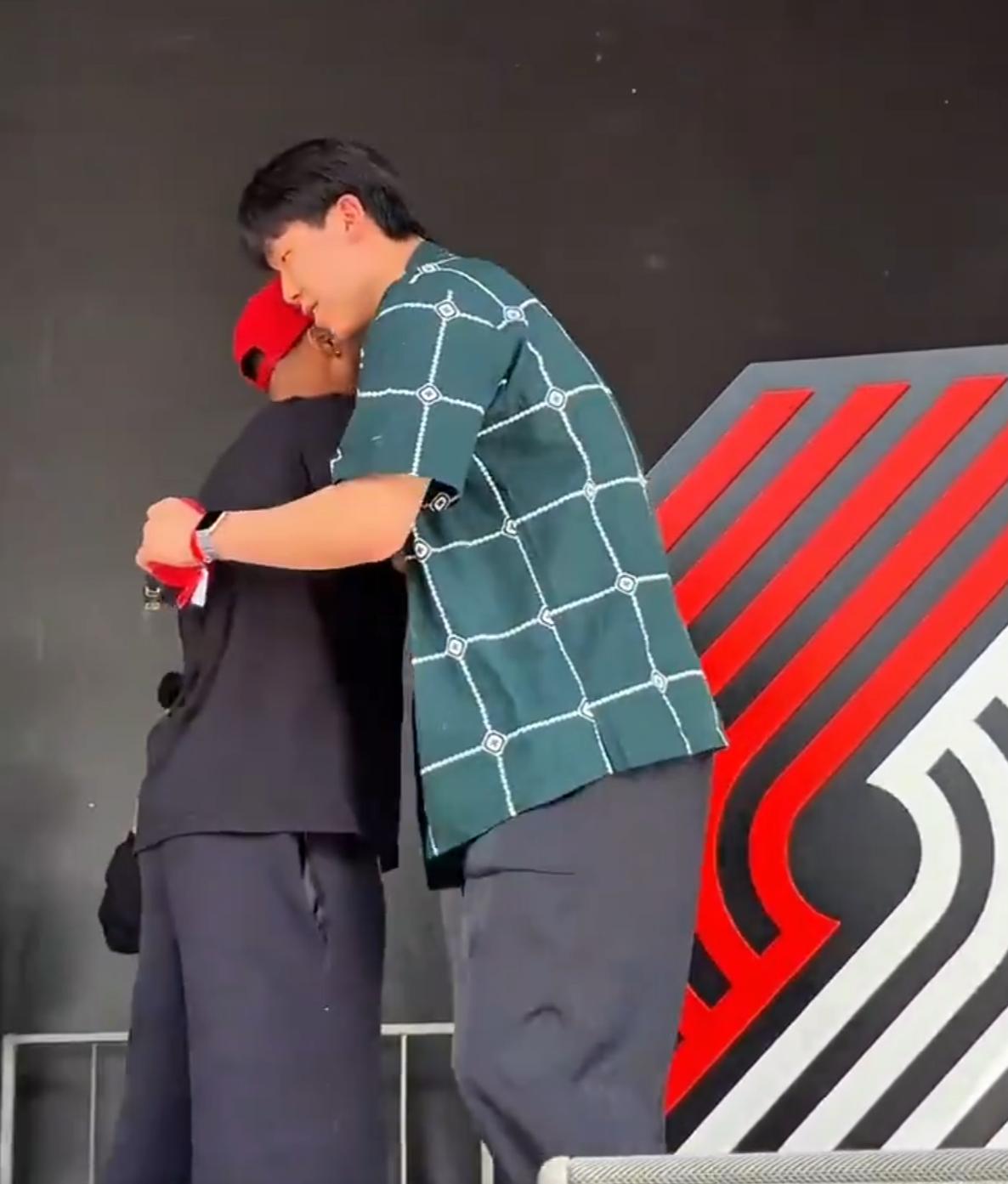 利拉德一看杨瀚森上来,还主动的微笑着去拥抱了小杨,作为对他的一个欢迎。并且可以注意到杨瀚森进场的时候,现场的欢呼声是最大的。这次为了欢迎利拉德,开拓者一共有10个人来到了现场,杨瀚森倒数第4个进场,地位不言自明。