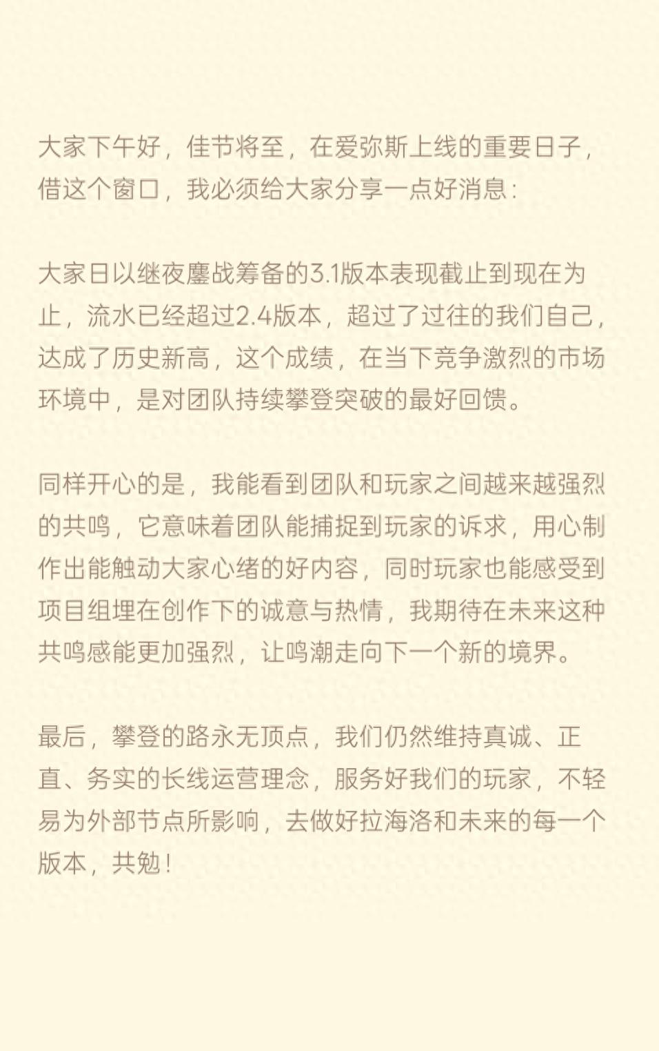 最后,攀登的路永无顶点,我们仍然维持真诚、正直、务实的长线运营理念,服务好我们的玩家,不轻易为外部节点所影响,去做好拉海洛和未来的每一个版本,共勉!