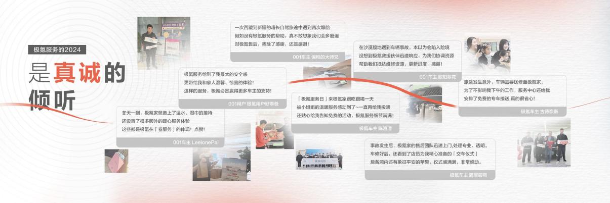 再看看其他一些极氪车主对极氪服务的评价。极氪001车主LeelongPai表示,冬天一到,极氪家就备上了温水、湿巾的接待,还设置了很多额外的暖心服务体验,这些都是极氪在“卷服务”的体现;极氪用户好乖爸表示,极氪服务给到了他最大的安全感,更带给他和家人温馨、惊喜的体验,这样的服务,极氪必然赢得更多车主的支持。更绝的是,极氪001车主欧阳翠花在沙漠腹地遇到车辆事故,本以为会陷入险境,没想到极氪救援伙伴迅速响应,为他们协调资源,成功脱险。