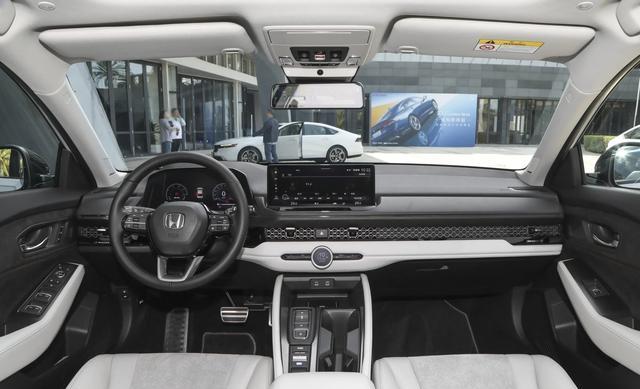 进入车内,本田家族内饰风格依旧,T字形中控台简洁规整。12.3寸中控屏与10.2寸液晶仪表显示清晰,用料柔软舒适。轴距2830mm,车内空间宽敞,满足家庭与商务需求。