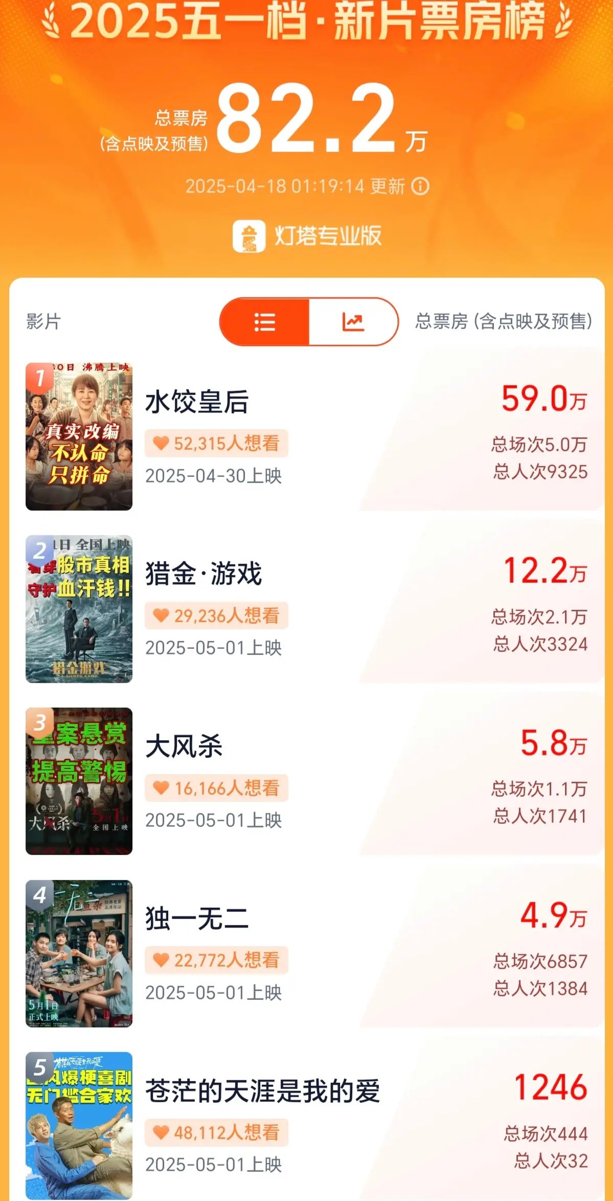 4月17日,五部角逐五一档期的影片同步开启预售,首日总票房累计突破80万元大关。其中由刘伟强执导、马丽搭档惠英红、朱亚文主演的温情剧情片《水饺皇后》以59万元预售成绩强势登顶,占据市场领先地位。