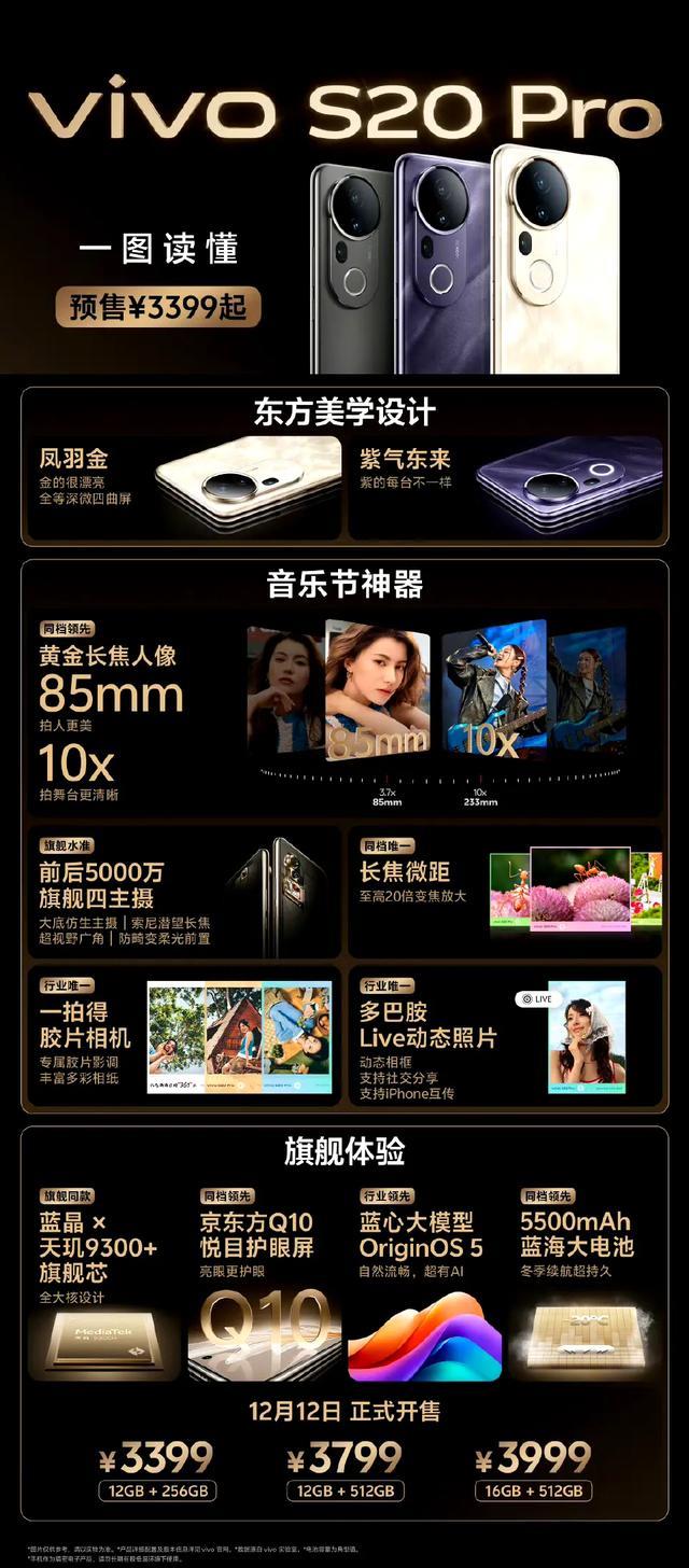 vivo S20 pro屏幕是6.67英寸,分辨率2800*1260p 1.5K BOE Q10等深四曲屏,处理器搭载了天玑9300+。前置相机是50Mp,后置三摄50Mp IMX921+50Mp超广角+50Mp IMX8823X潜望长焦微距。电池组合是5500mAh+90W,短焦光学指纹,机身材质塑料中框,机身厚度及重量是7.43mm/193g/194g