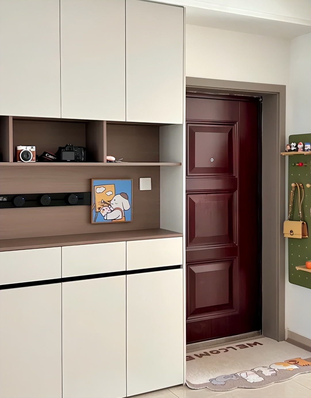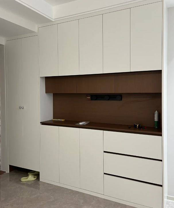 家里装修,一般纯色的柜子搭配一个木纹的装饰就很高级了,真的没必要选很多颜色。