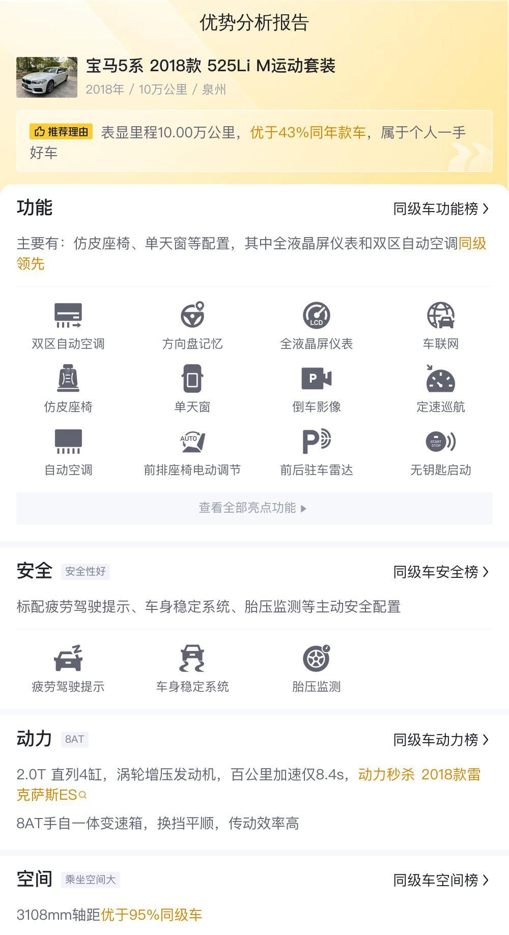 空间方面,2018款 525Li M运动套装的车身尺寸为5087mm1868mm1500mm,轴距为3108mm。宽敞的乘坐空间,即使是后排乘客也能享受到舒适的腿部空间。520L的行李舱容积,也足以满足日常出行和商务需求。那么,回到我们最初的问题,购买一辆二手宝马5系 2018款 525Li M运动套装,到底值不值?