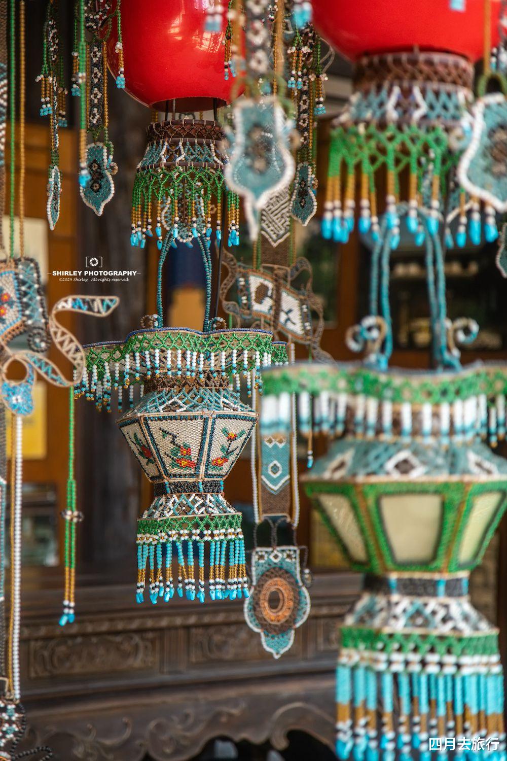 除了木雕之外,卢宅另一大看点就是制作于1919年的宝盖索络联三聚七彩穗羊角灯。这是一盏六角形,通高4.05米,直径2.10米,重127.5公斤,用40万颗玻璃彩珠穿就的堂灯,已载入世界吉尼斯纪录。远观近看皆如视觉盛宴,犹如一座灯山光彩耀目,与《红楼梦》中提到的荣国府大堂灯如出一辙,只是肃雍堂大堂灯更胜一筹。