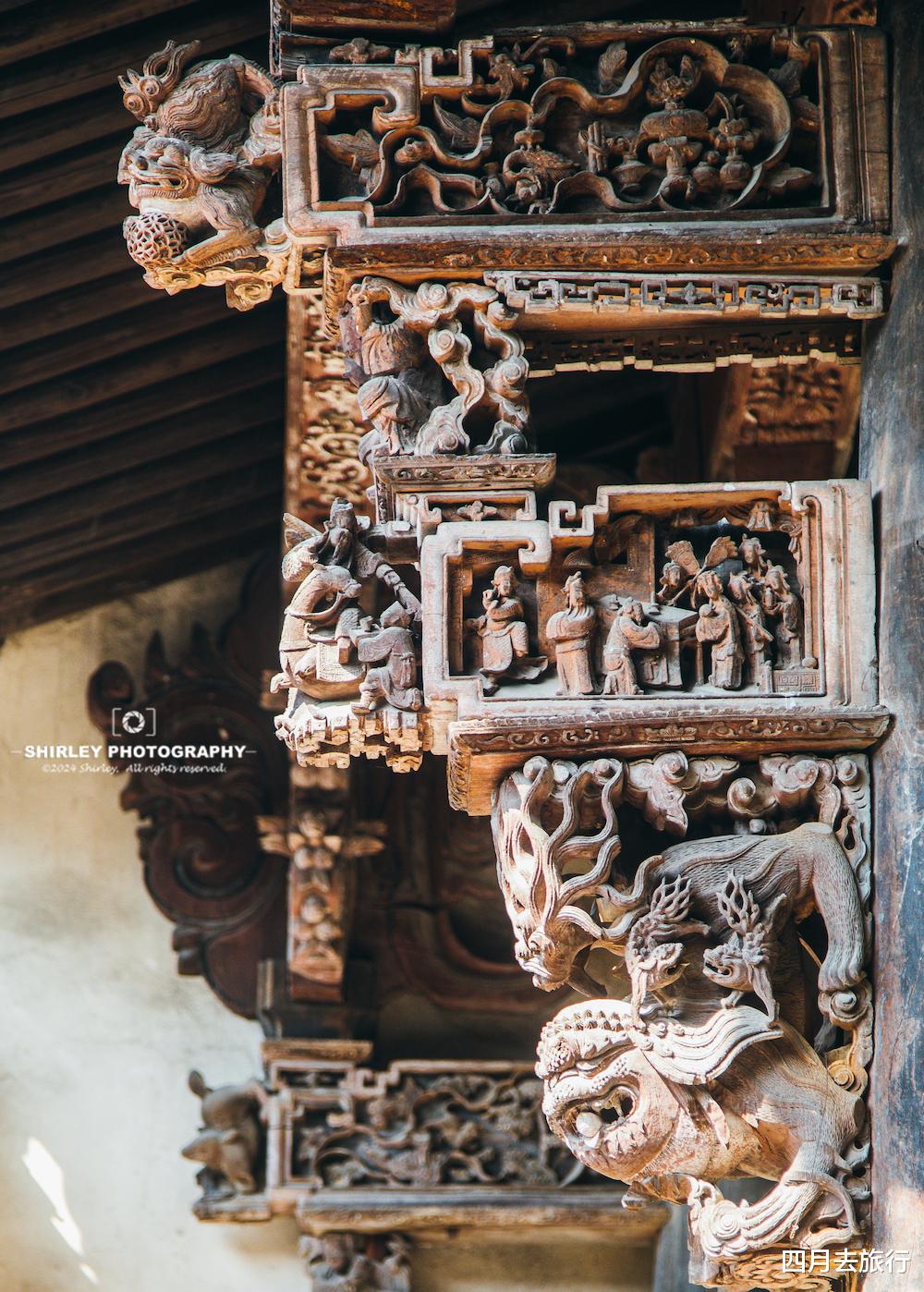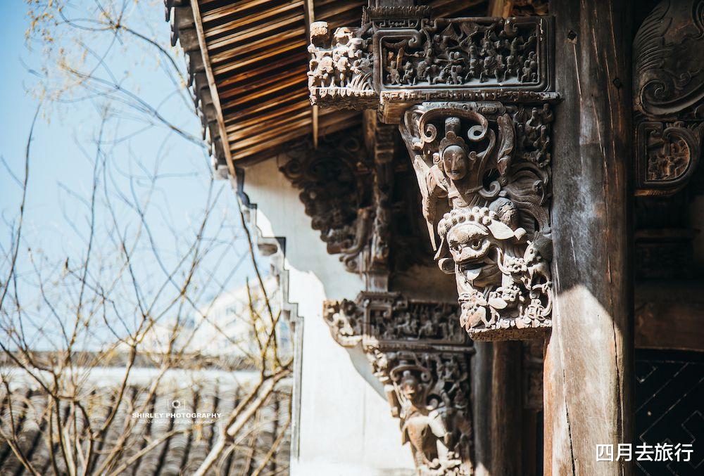有了这些基础,逛卢宅时木雕就是一大看点。漫步其间,随便一抬头或是一瞥,便会与奢华繁复的东阳木雕撞个满怀。无论是门窗、梁枋、牛腿、雀替、或是斗拱,无时无刻都在彰显着东阳木雕的巧思妙想。雕花题材涉及人物故事、花鸟鱼虫、神话传说;刀法细腻流畅,让人不禁为工匠的精湛技艺所折服。偌大的卢宅,堪称一座露天的“东阳木雕博物馆”。
