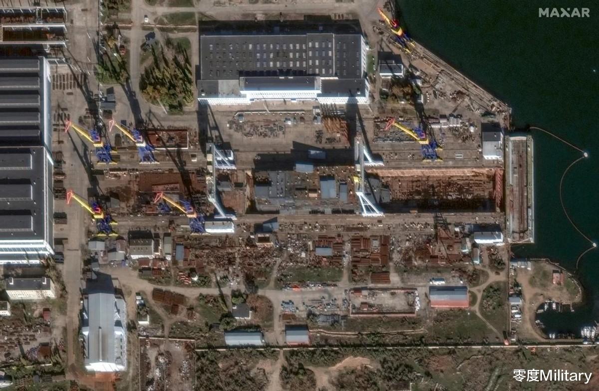 从《麦克萨科技》和《防务快报》提供的卫星图像来看,“伊万·罗戈夫”号两栖攻击舰仍在建造中,但舰体的完整程度已远超2023年乃至2024年中期的状态。现在舰体上可见两个大型长方形开口,可能是用于连接飞行甲板与下方机库的升降机。不过,“伊万·罗戈夫”号目前还没有安装飞行甲板和舰岛结构。