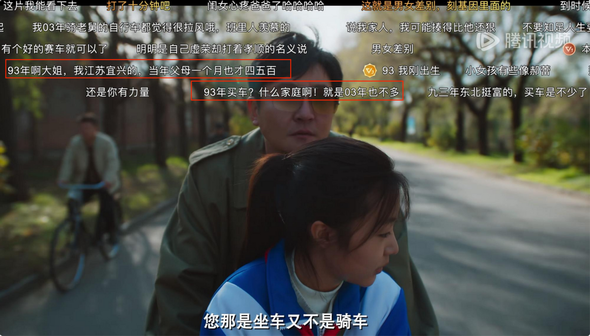 弹幕上更是常常出现观众的集体疑惑“当年父母一个月才四五百”、“93年买车?什么家庭啊!就是03年也不多”。