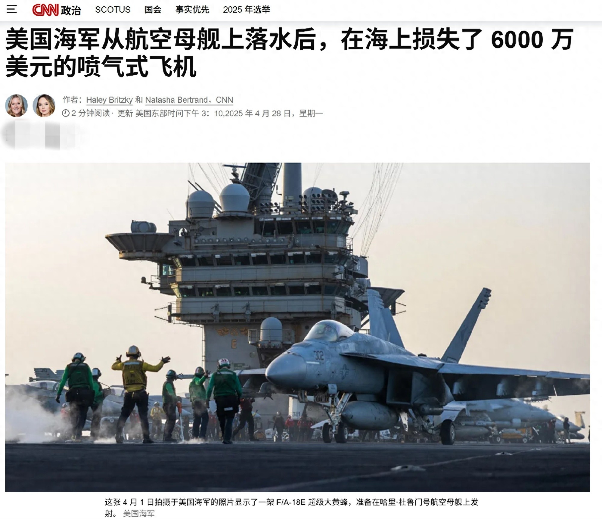 美国海军F/A-18E超级大黄蜂战斗机发生坠海
