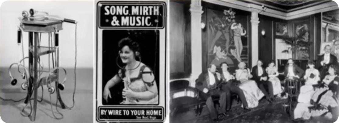 为了在家听到现场音乐表现,和实况转播,出来了一个叫做「Electrophone家用音乐聆听系统」的东西,属于提供订阅服务,和苹果订阅软件一样的,这个服务流行了30年,直到20世纪20年代才被无线电技术取代。