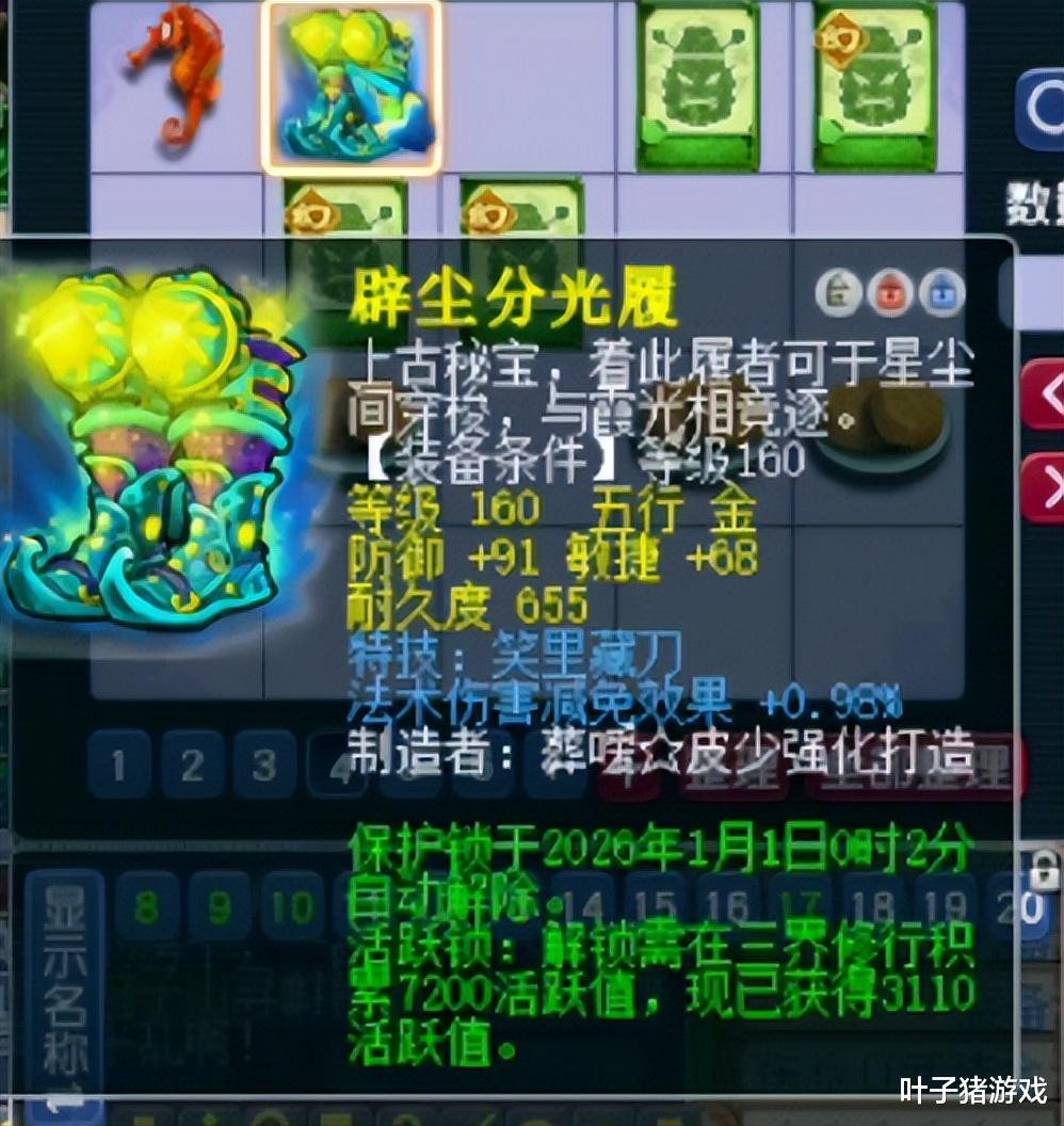 最近,一位老板在鉴定160级装备时,幸运地炸出一双笑里藏刀搭配法术减免0.98%的鞋子。这双鞋子不仅基础敏捷接近极限,还附带法术伤害减免效果,能为一速法系变相增加法术防御。再加上笑里藏刀这一PK核心特技,可以有效打乱对手的特技节奏,战略价值显著。