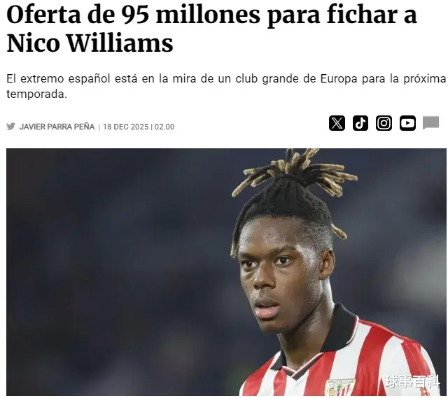 路易斯·迪亚斯的速度与纵深冲击如今属于拜仁,利物浦急需填补空白。据西班牙媒体fichajes消息透露,FSG(芬威体育集团)正准备向毕尔巴鄂竞技开出9500万欧元的报价,目标锁定23岁的西班牙王牌——尼科·威廉姆斯。