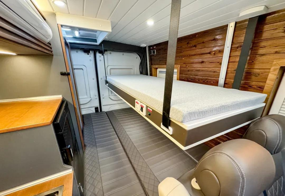 休息区是凯风3L的一大亮点。纵置床设计可以组合延展,扩展休息空间。更巧妙的是,车顶还设计了电动升降床,充分利用了垂直空间。这样一来,即使是一家三口出行,也能拥有舒适的睡眠空间。