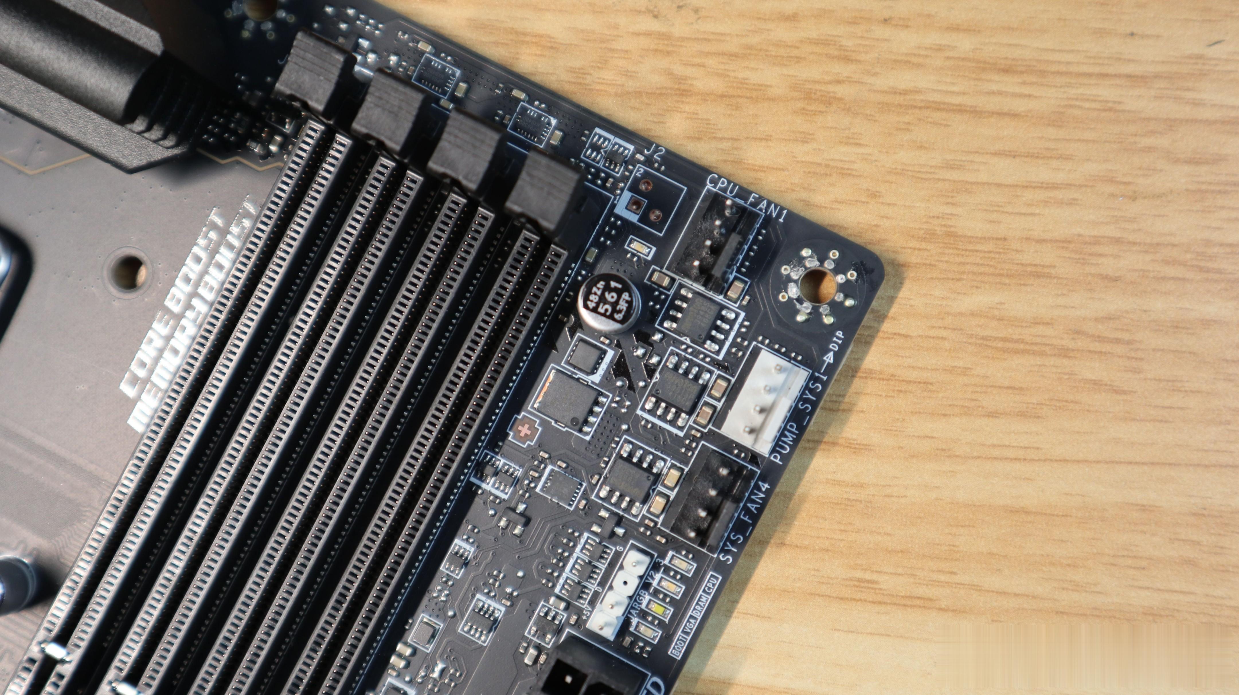CPU风扇接口和水冷接口和传统主板相比更偏向右边,这种设计更有利于走背线;机箱风扇接口下方有Debug灯和一组5v_ARGB接口。