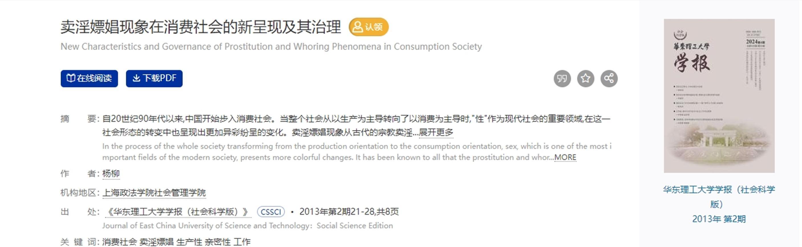 2、卖淫嫖娼现象在消费社会的新呈现及其治理——《华东理工大学学报(社会科学版)》CSSCI 2013年第2期21-28,共8页