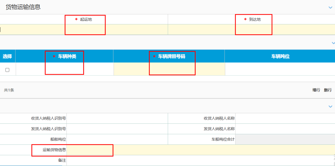 据实填写货物运输信息,其中带有 “ * ”标识的为必填项