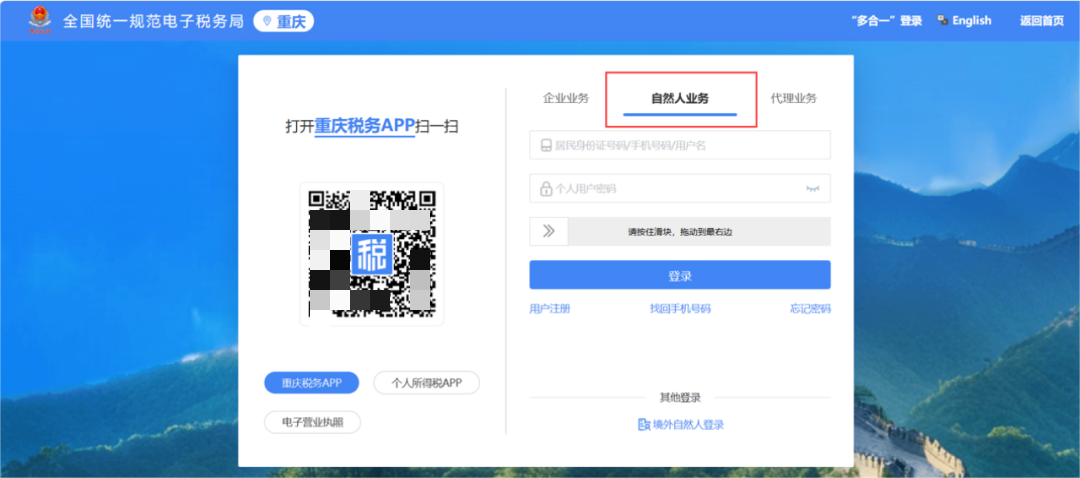 选择“自然人业务”,依次填写完相关信息后完成登录