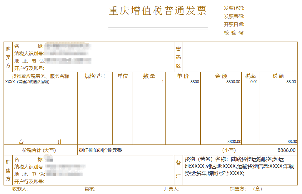 相关信息填写完毕,系统自动生成发票票面信息,可以对填写内容进行检查预览,此前填写的“起运地”、 “到达地”等信息均会反馈在发票“备注”栏