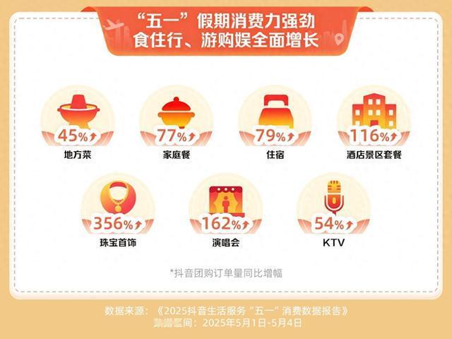 不少人在假期选择购物休闲,数据显示,假期期间,演唱会、KTV抖音团购订单分别增长162%和54%。此外,珠宝首饰抖音团购订单量同比增长高达356%。