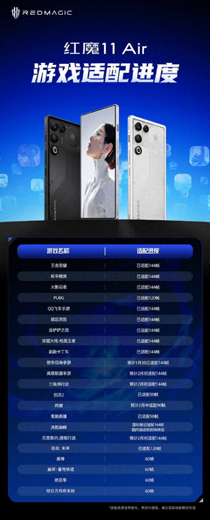【科技快报网】红魔游戏手机官微今日公布了红魔 11 Air游戏适配进度,覆盖超 20 款游戏。其中《王者荣耀》《火影忍者》《和平精英》《QQ 飞车手游》等,已支持144帧游玩。