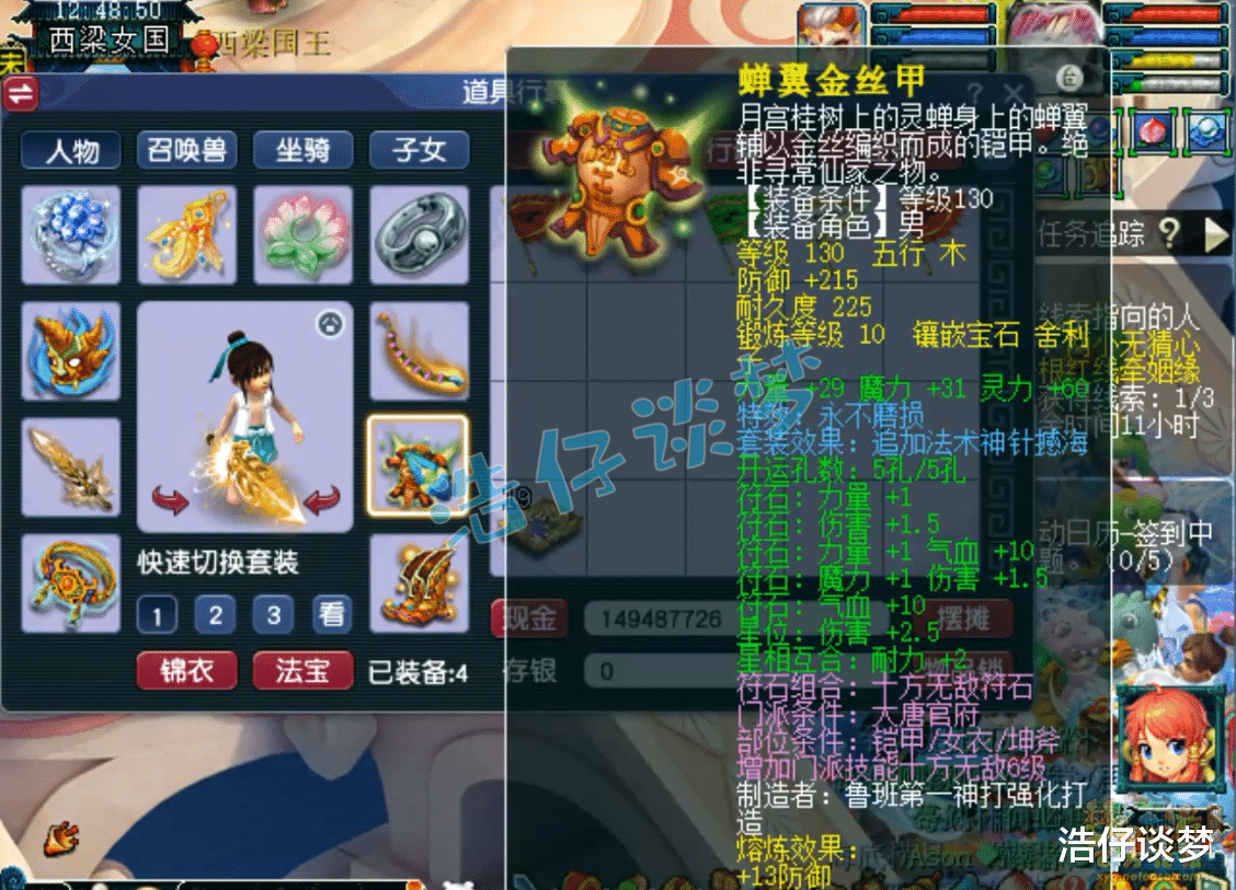 130级不磨神针撼海套铠甲,力魔双加60,打了10锻舍利子,特别适合虎贲大唐的装备!