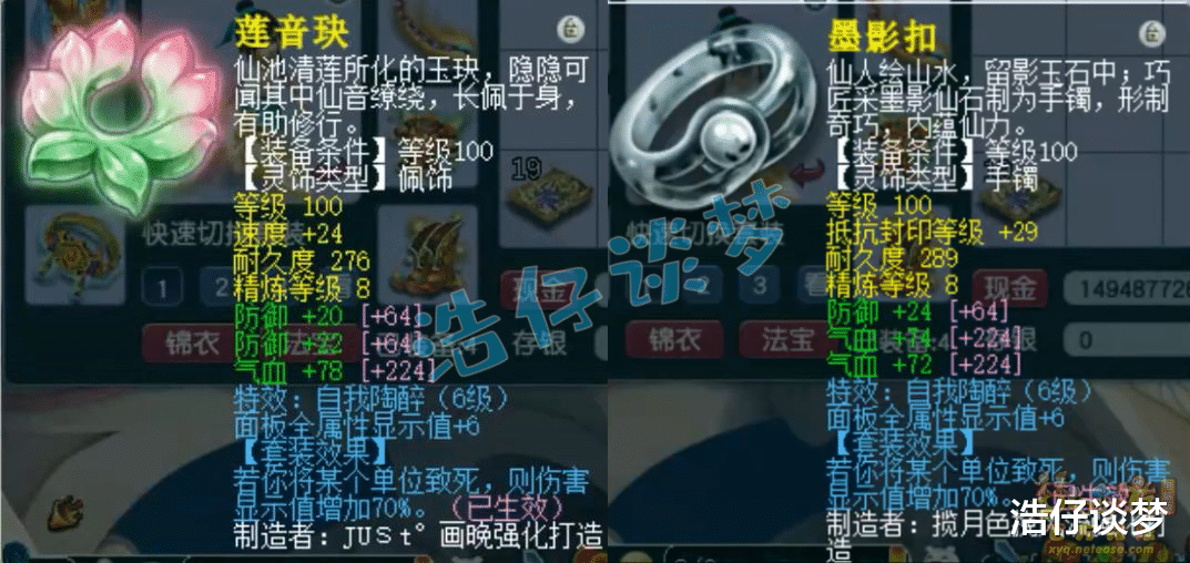 戒指和耳饰没有截上图,应该是伤害和法伤混搭的,配饰下排双防御一气血,手镯下排双气血一防御,特效都是6级自我陶醉!