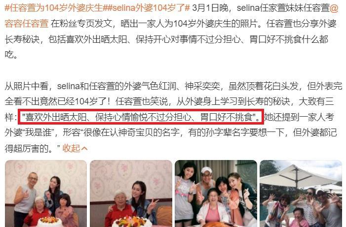 Selina任家萱一家,总是能引发公众的关注。近日,妹妹任容萱分享了104岁外婆的庆生照,再次将这个家庭推向大众视野。照片中,外婆精神矍铄,笑容慈祥,完全不像百岁老人。这一景象引发了网友对长寿秘诀的热烈讨论,也让人们再次关注到家庭的意义和爱的传承。