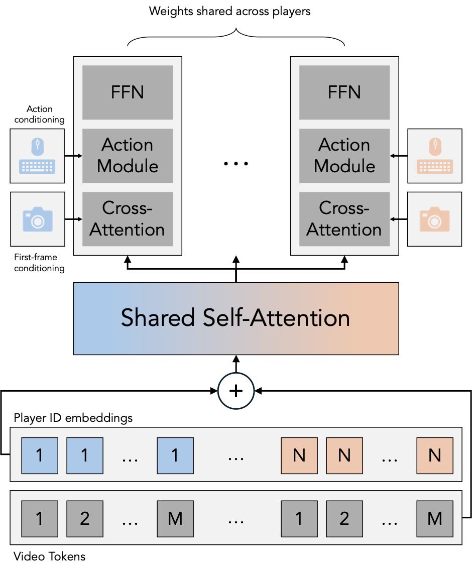 其次,引入了多人自注意力层,将所有玩家的 Token 进行拼接并互相对照,使得信息可以在每个 DiT 模块内部实现玩家间的交换。对每名玩家独立应用 3D RoPE ,并添加了可学习的玩家 ID 嵌入,以便模型区分不同个体。