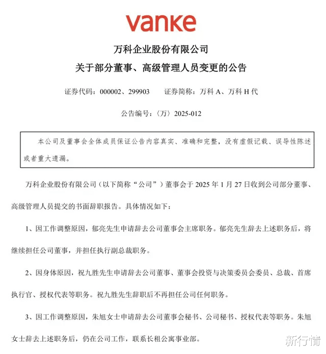 当然,早在2025 年 1 月 27 日,郁亮已辞去万科董事会主席职务,转任执行副总裁,由深铁集团原董事长辛杰接任董事长,多位深铁系高管进入核心管理层。