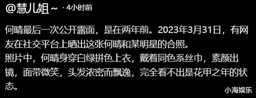 在2025年5月17日,演员朱媛媛去世时,不少网友在网上悼念朱媛媛时,有知情人在留言区透露。演员何晴也得癌症了,在北京某医院看了好长时间了,已经大面积扩散了。当时有网友留言不敢相信。