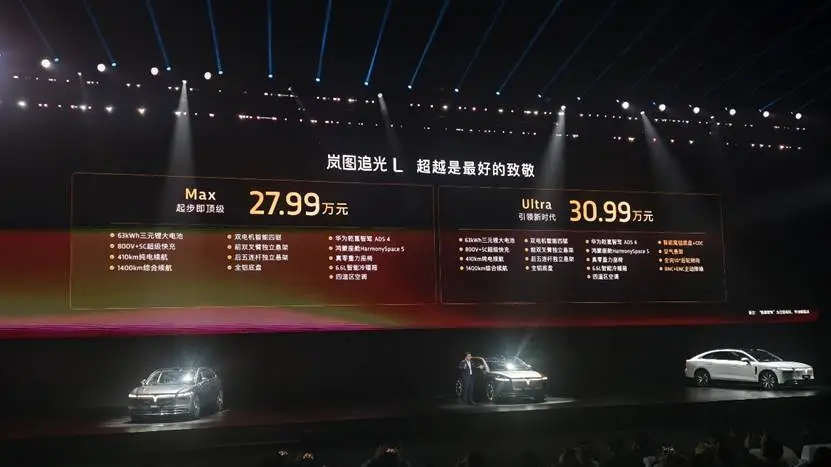 12月10日,岚图追光L正式上市,发布两个版本车型,指导价为27.99万-30.99万元。作为一款插混轿车,岚图追光L搭载凭华为乾崑智驾ADS 4、鸿蒙座舱,采用800V架构,配备63度大电池+5C超充等配置,实现410km纯电续航,1400km综合续航。