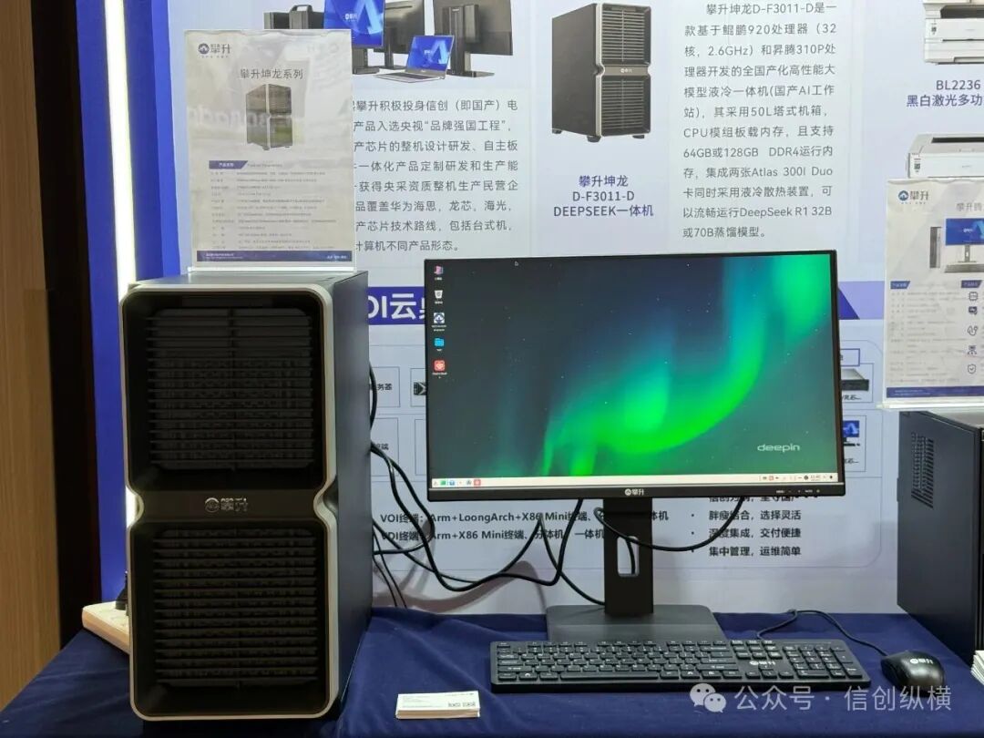 沈国良:这里分两个层面,目前前面几期替换的信创电脑都不具备 AI 能力,但通常来说,信创电脑的生命周期一般是5-6年,今年你的信创PC不带 AI 可能使用起来觉得问题不大,但明年你的电脑如果不带 AI,这可能就变成了“一堆废铁”。所以说攀升科技在AIPC 跟信创结合上,会进行两大布局。第一个布局是引入:我们跟科大讯飞合作,引入星火大模型,在我们现在这种常规的台式工作站、信创PC 里进行部署,实现了 AI 大模型跟信创 PC的结合。目前,攀升科技最新推出的AI PC已实现“两问三办”的功能,满足了部分政务办公的智能化需求。第二个布局,攀升科技目前基于华为的“鲲鹏+昇腾”全国产算力卡,把本地32G 大模型部署在本地,让工作站具备公文写作等一系列适合党政场景的 AI PC 的能力。这次大会上推出的攀升坤龙系列AI工作站就是这样一款产品(见下图)。