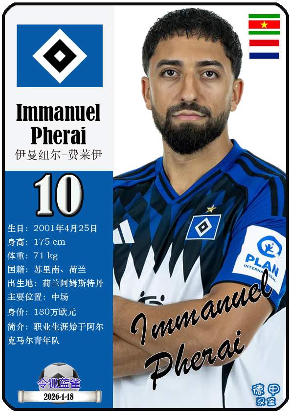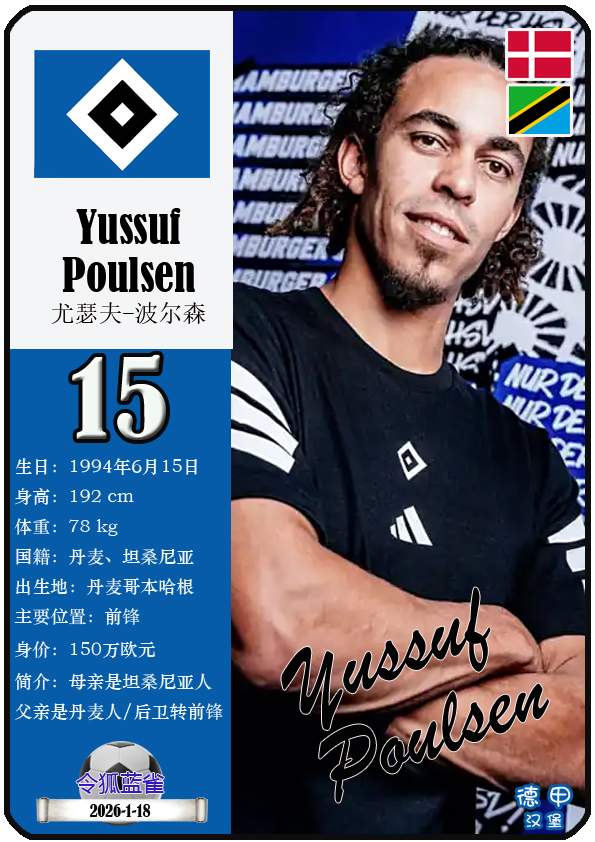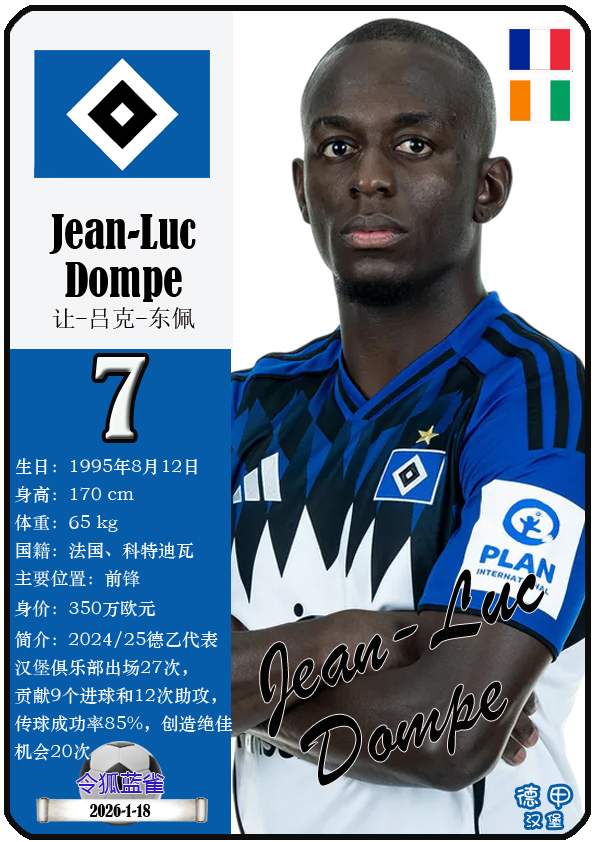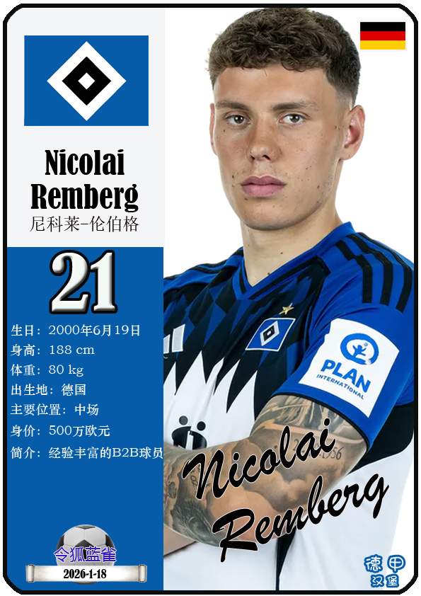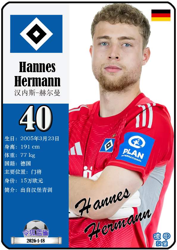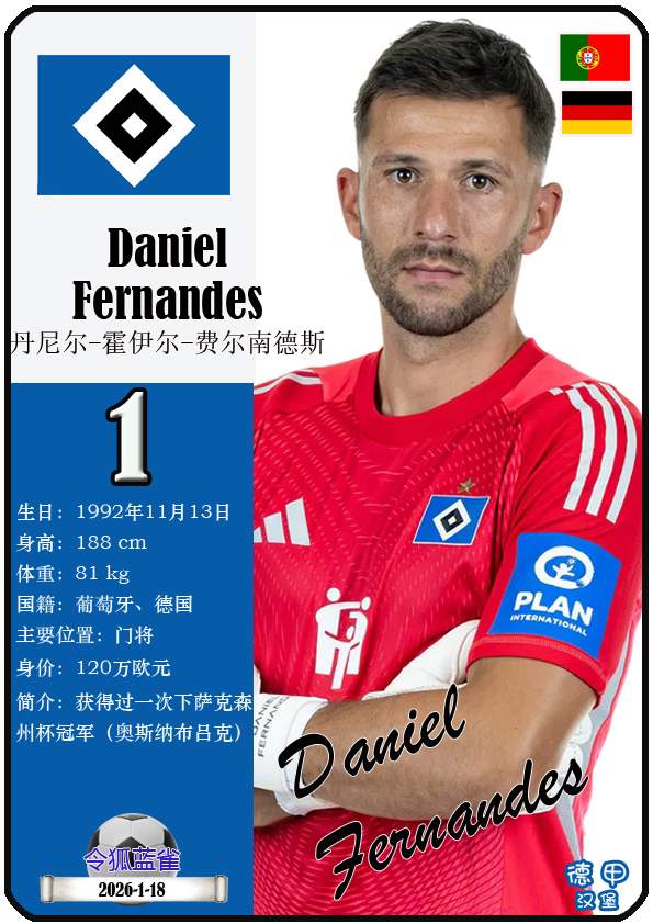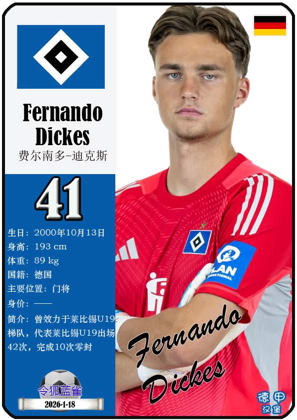 1887年9月29日,汉堡足球俱乐部的三个前身之一日耳曼尼亚体育俱乐部正式成立,距今已有139年历史。截至2026年1月19日,球队主教练是梅林.波尔津,队内拥有球员伊曼纽尔-费莱伊、罗伯特-格拉策尔、让-吕克-东佩等。本期以球星卡的形式展示目前德甲汉堡足球俱乐部足球俱乐部的29名球员(按球衣号码排序):