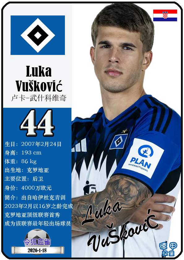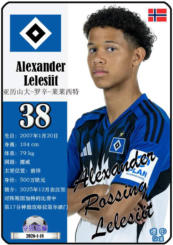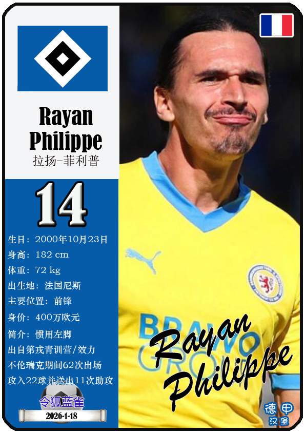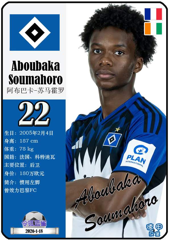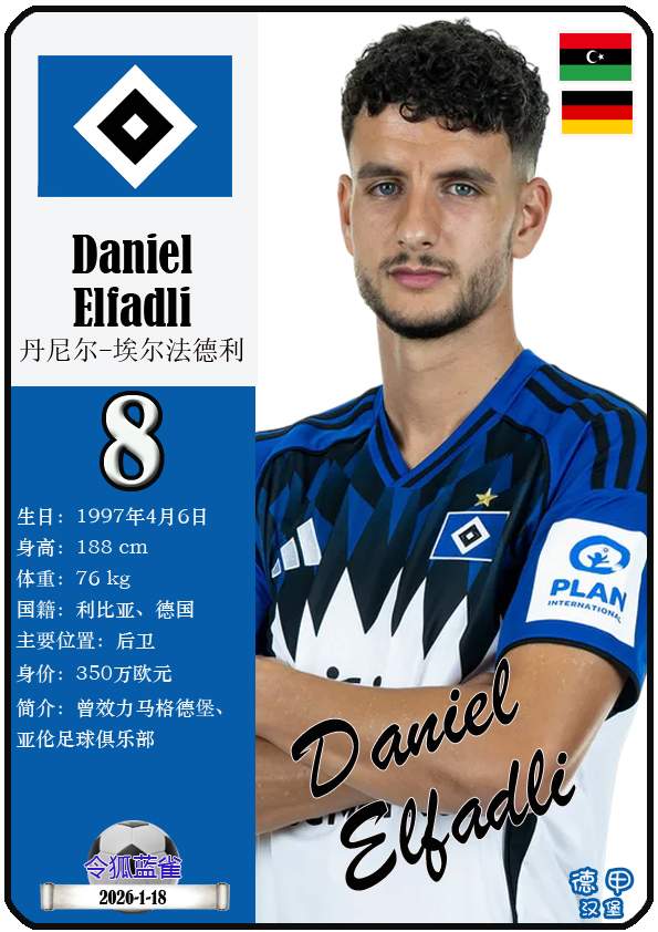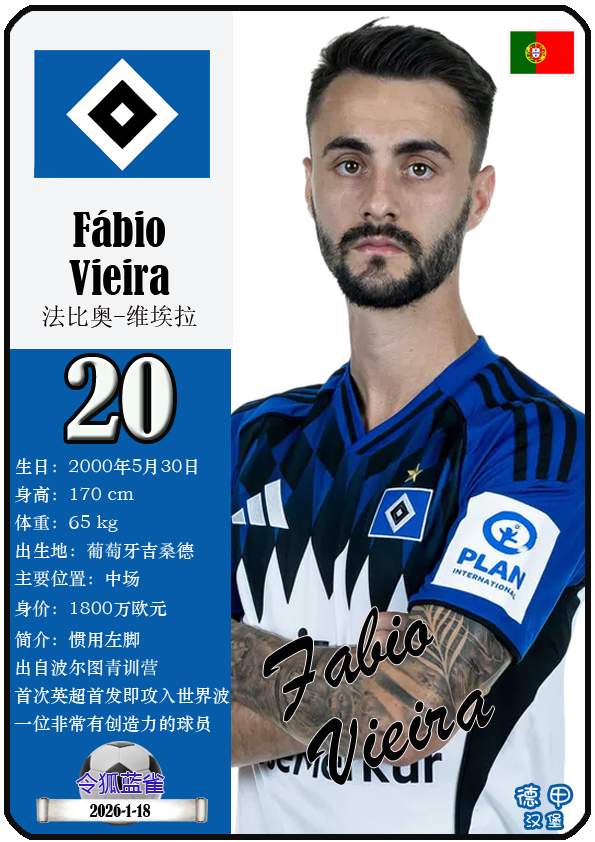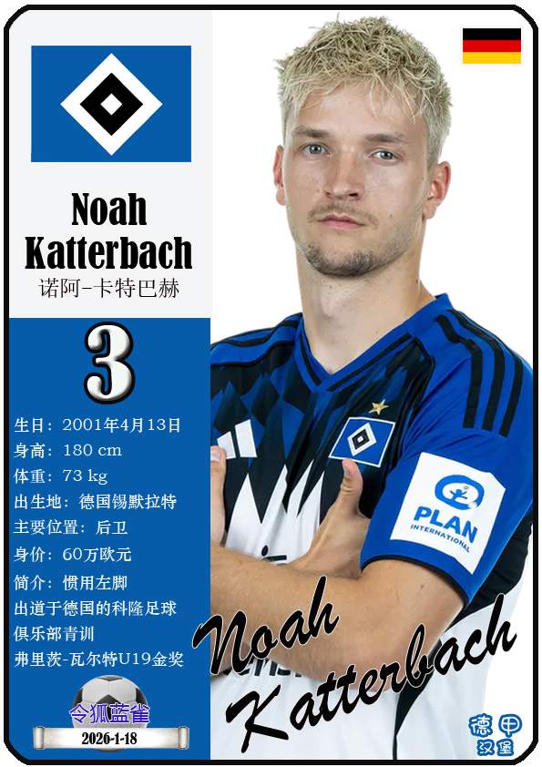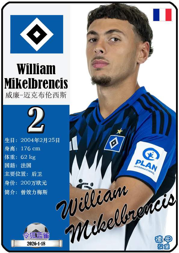 1887年9月29日,汉堡足球俱乐部的三个前身之一日耳曼尼亚体育俱乐部正式成立,距今已有139年历史。截至2026年1月19日,球队主教练是梅林.波尔津,队内拥有球员伊曼纽尔-费莱伊、罗伯特-格拉策尔、让-吕克-东佩等。本期以球星卡的形式展示目前德甲汉堡足球俱乐部足球俱乐部的29名球员(按球衣号码排序):