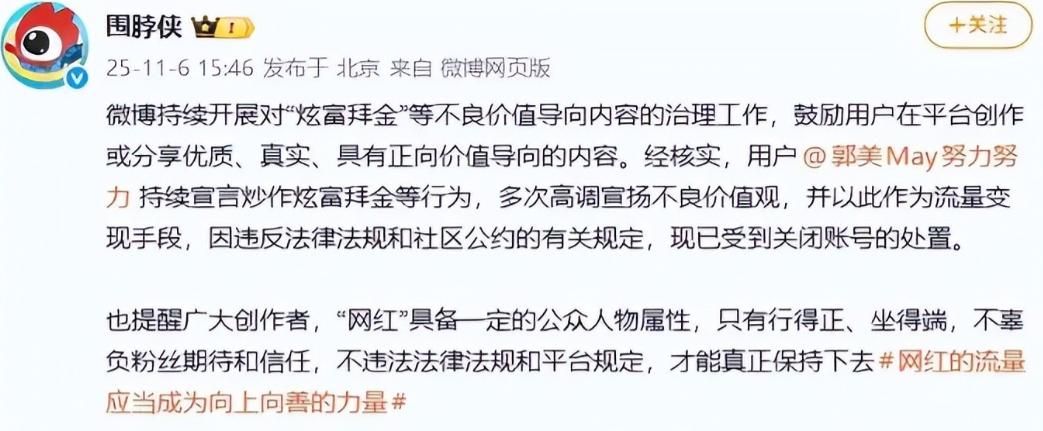 郭美美从此彻底消失在网络平台上,成为网红圈“屡教不改”的反面教材。