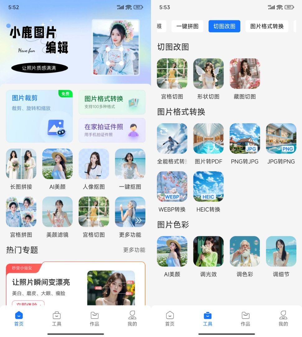 1. 小鹿图片编辑小鹿图片编辑,图片界的魔术师!P图、美图不在话下,长图拼接、抠图换背景样样精通。一键美颜加滤镜,证件照、宫格拼图轻松搞定,让你的照片秒变大片!