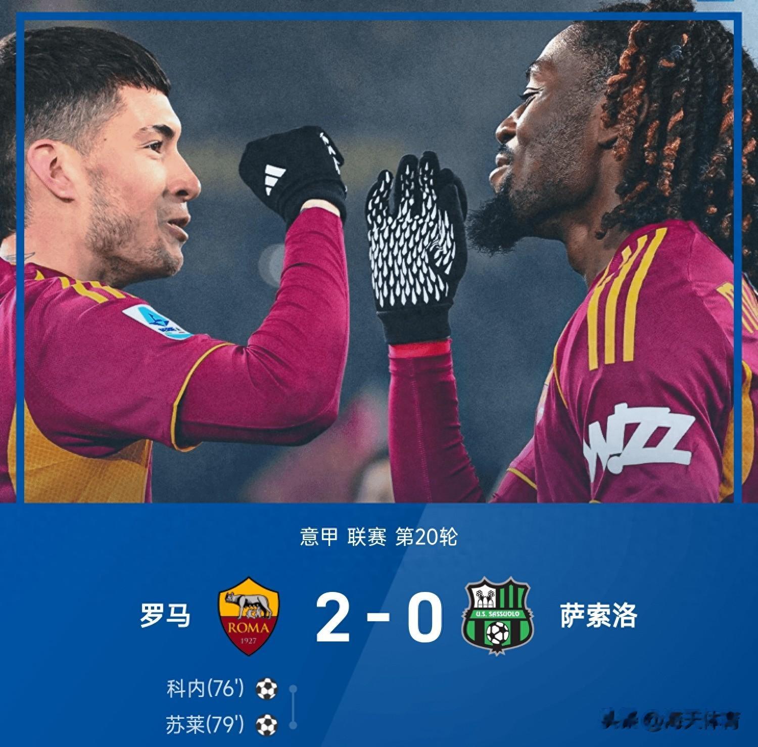 1月11日 25/26赛季意甲联赛第20轮,罗马2-0战胜萨索洛。上半场比赛,两队互交白卷。易边再战,苏莱4分钟内传射建功,帮助罗马2-0锁定胜局。补时阶段,沙拉维再入一球,但因越位在先进球无效,最终罗马主场轻取萨索洛全取三分。最终罗马主场2-0战胜萨索洛,罗马取得联赛两连胜+先赛积39分升至第3名。