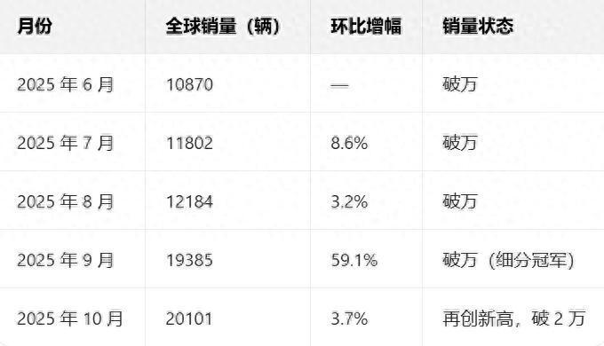 10月,深蓝S05在高基数基础上再攀新高,全球销量突破2万辆大关,达到20101辆。这一表现在竞争激烈的紧凑级SUV市场中稳居头部阵营。从9月的销量跃升到10月的持续稳增,深蓝S05近五个月用持续的销量增长,进一步夯实了其在同级市场中的核心地位,成为兼具市场认可度与增长潜力的标杆车型。