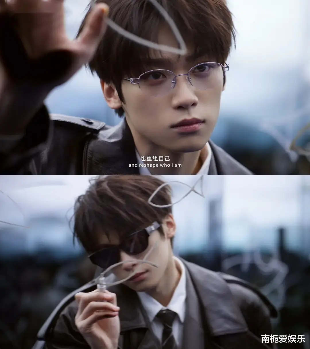 当镜头转向银边与金丝细框眼镜,梓渝的气质也随之柔化。白衬衫配简约西装,他抬手轻扶镜架,眼神清澈而坚定,仿佛从校园剧走出的温柔学长,又似自带光晕的清冷贵公子。这一系列造型突出了眼镜对眉眼线条的修饰作用,鼻梁与镜框的贴合宛如量身定制,被粉丝戏称“连呼吸都带着氛围感”。