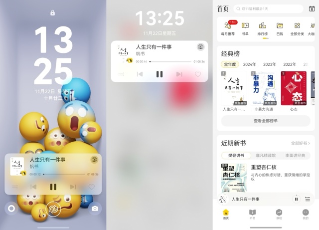 夜晚降临,忙碌了一天的你终于有时间静下心来享受个人时光。此时帆书App的锁屏卡片成为了最好的伴侣。无论是简约的胶囊式设计,还是充满情调的大卡片,都能让你在任何情况下都能轻松控制播放进度,即便是躺在床上,也能享受不间断的听书体验。