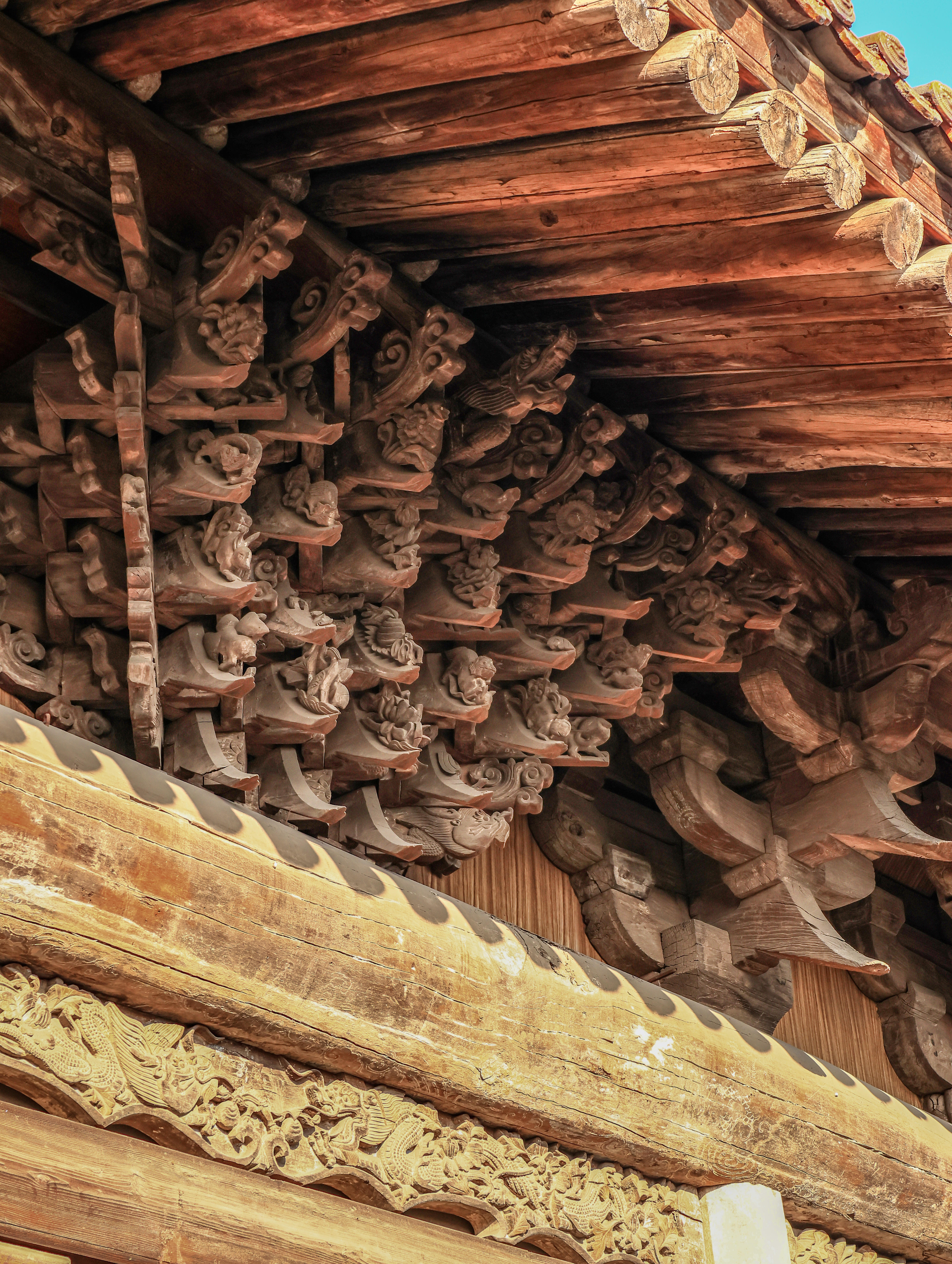 进到寺院核心,大雄宝殿一抬头就能看出元代建筑的脾气,单檐歇山顶,斗拱不是宋式的精巧,也不是清式的繁密,而是疏朗粗壮,带着北方游牧民族入主中原后的粗犷大气,每一组斗拱都像实打实的骨架,撑着整座殿宇几百年不晃。最特别的是檐墙正中上部的窗口,做成了蒙古包的形状,这在汉地佛寺里简直是醒目的标签,一眼就能断定是元代遗存,是草原文化和中原营造法式撞出来的独特印记,不是后人仿得出来的。墙身厚近一米,从上到下微微收分,稳得像座小山,出檐又远,雨天雨水根本打不到木柱上,这些看似朴素的设计,全是古代工匠靠经验磨出来的实用智慧,没有花里胡哨的装饰,却把坚固、耐用、美观揉在了一起。