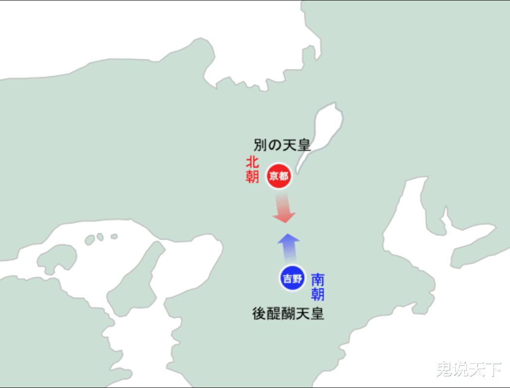 建武二年(1335年)十月,对后醍醐天皇“建武新政”不满的武士拥立足利尊氏在关东起兵造反。经过几场激战,足利尊氏在建武三年(1336年)十一月控制了京都,拥立“持明院统”的光明天皇。“大觉寺统”的后醍醐天皇逃往京都以南的吉野,日本进入了南北两个天皇并立的南北朝时代。